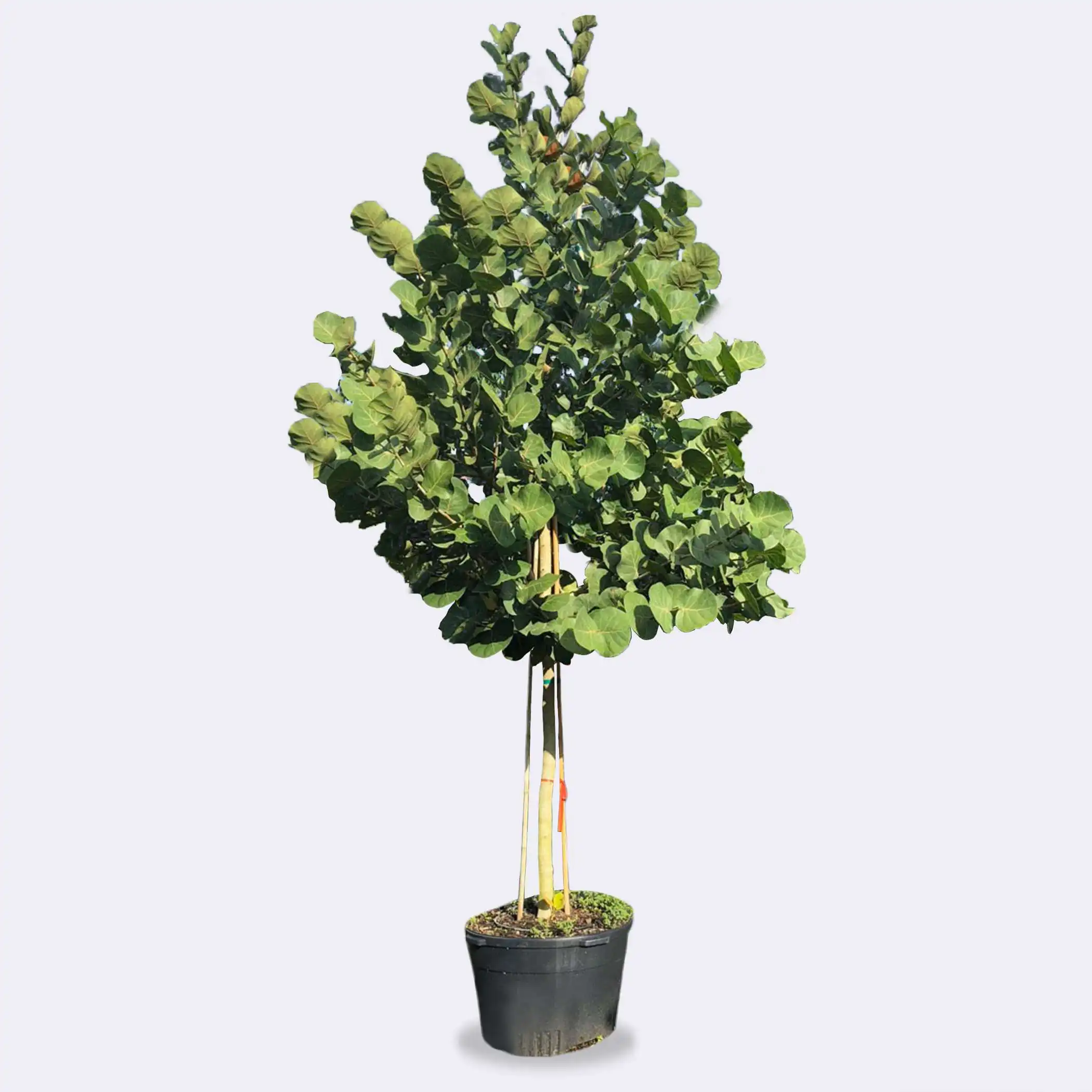 The Sea Grape Tree, often simply referred to as Sea Grape, is an emblem of tropical and coastal landscapes. With its large, rounded leaves and clusters of fruit resembling grapes, it’s both an ornamental and functional addition to coastal areas, often playing a role in stabilizing beachfront. Sea Grape exhibits a moderate growth rate. While it can function as a low-lying shrub in some landscapes, in optimal conditions, it can grow into a tree reaching heights of 20-35 feet. Thriving in full sunlight, the Sea Grape is tailor-made for sun-drenched beaches and coastal regions. It can tolerate partial shade but flourishes and fruits best in direct sunlight. Being a coastal plant, the Sea Grape is exceptionally drought-tolerant once established. However, it appreciates occasional watering, especially in very dry periods. Its salt tolerance is notable, making it an ideal choice for seaside landscapes. The large, leathery leaves of the Sea Grape can vary in color from green to reddish, especially when young. The tree blooms small white flowers which later turn into grape-like fruit clusters, varying from green to a deep purple when ripe. These fruits are edible and often used in jams and jellies. While generally robust, it’s advisable to plant the Sea Grape in areas protected from strong winds to prevent breakage. The Sea Grape Tree is more than just a beachside ornament; it’s a guardian of the shores, preventing erosion with its robust root system. Its unique aesthetic, combined with its ecological importance, makes it a cherished feature of tropical landscapes. Whether offering shade on a sunlit beach or being the focal point in a coastal garden, the Sea Grape stands as a testament to nature’s adaptability and beauty.